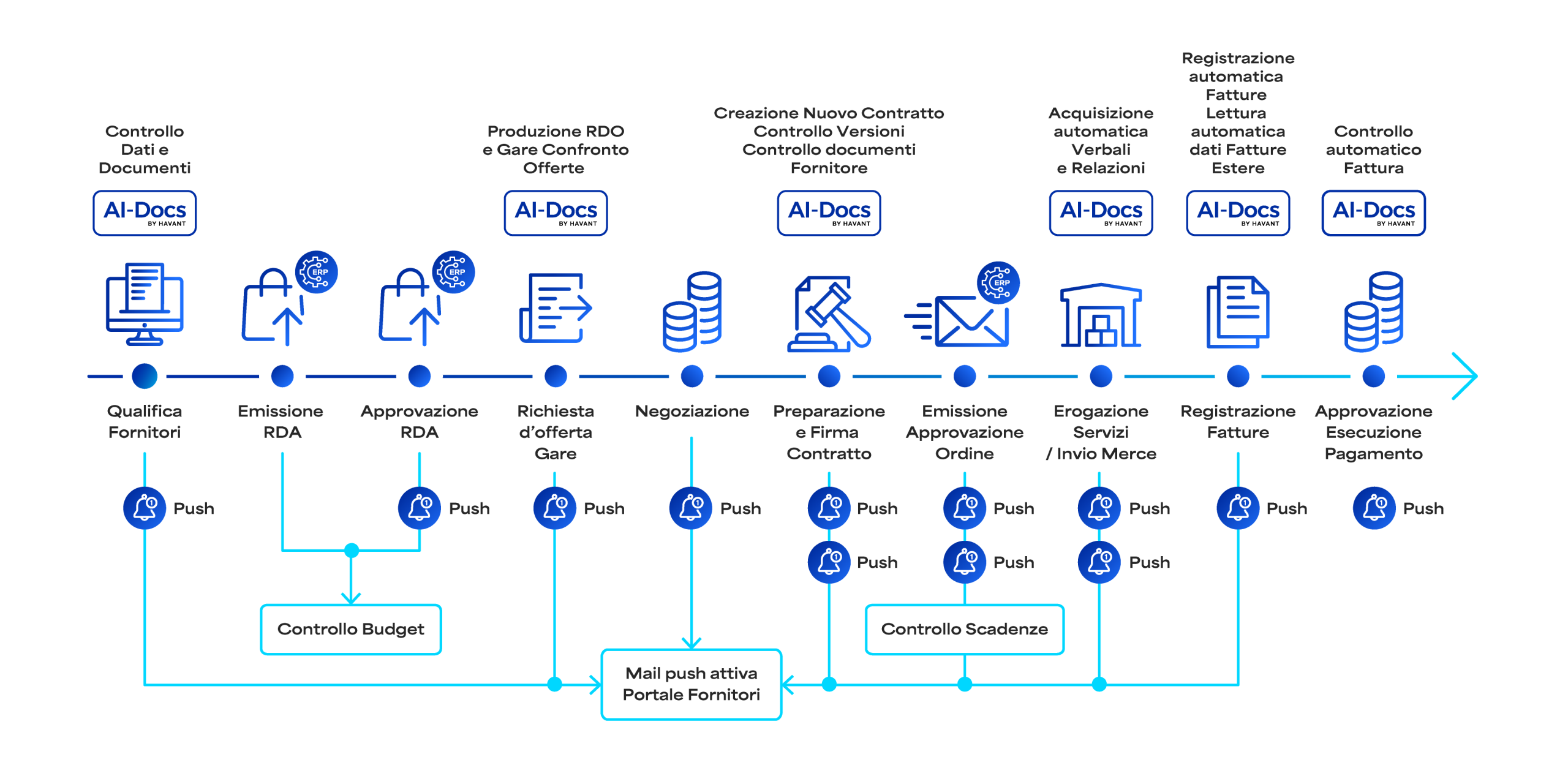 The Digital Procurement solution covers the entire Source-to-Pay lifecycle, adapting to corporate processes and integrating natively with ERP systems and existing information systems.